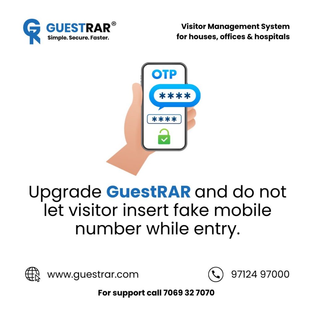 Upgrade GuestRAR to enhance security protocols by ensuring the authenticity of visitor information. Prevent the entry of fake mobile numbers during check-in for more reliable visitor management. #GuestRAR #VisitorManagement #SecurityUpgrade #DataAccuracy #AccessControl